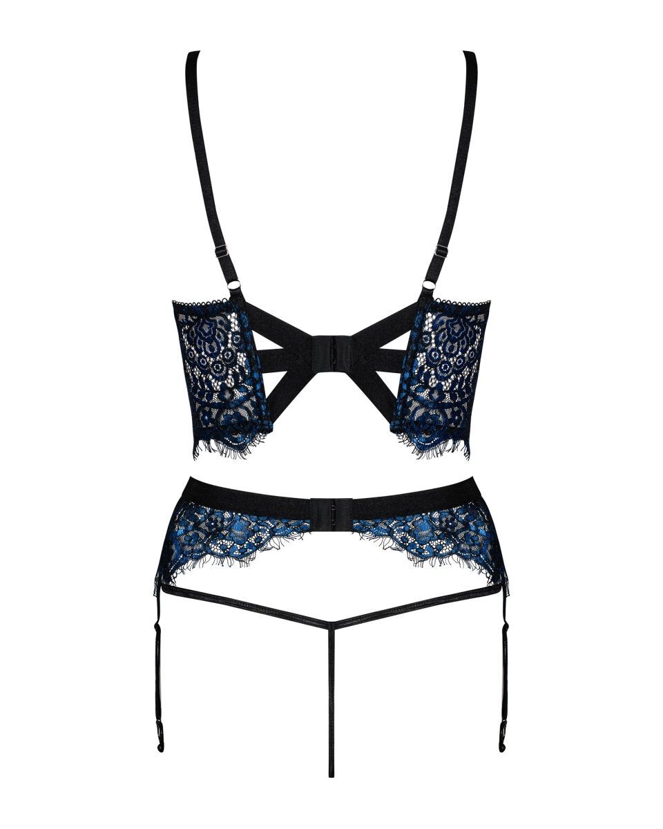 Комплект белья из серии Yassmyne из кружева. Бюстгальтер на косточках, тонкие бретельки регулируются по длине, на спине застежка-удлинитель. Широкое кружево под бюстом визуально вытягивает силуэт. Пояс с застежкой-удлинителем на спине, пажи для чулок регулируются по длине. Кружевные трусики-стринги. В комплекте: бюстгальтер, трусики-стринги, пояс для чулок.