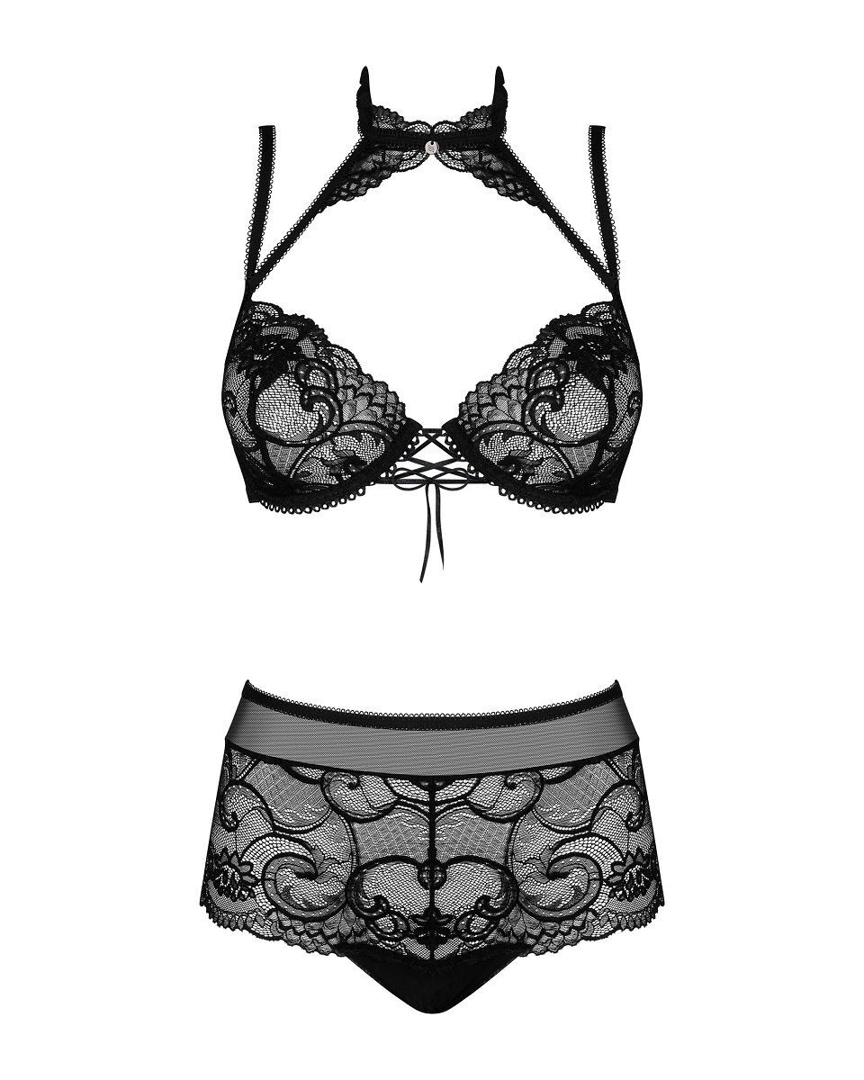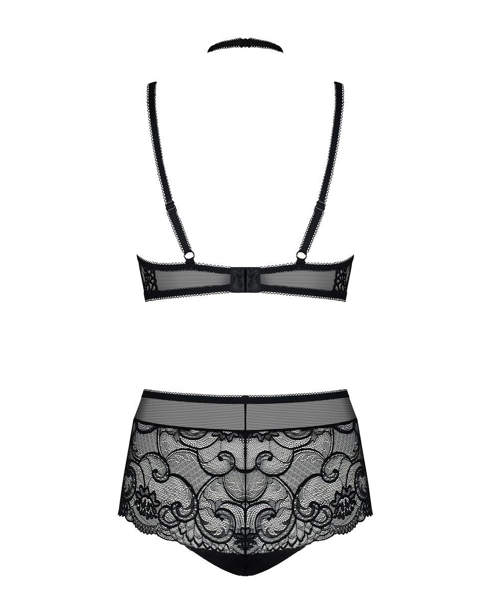 Комплект белья из коллекции Elizenes из гипюра и вуали: бюстгальтер мягкий на косточках, тонкие бретели регулируются по длине, на спине застежка-удлинитель, между чашек шнуровка. В зоне декольте бретели соединяются с кружевным чокером, на шее застёжка. Трусики-панти с высокой линией талии. В комплекте: бюстгальтер, трусики.