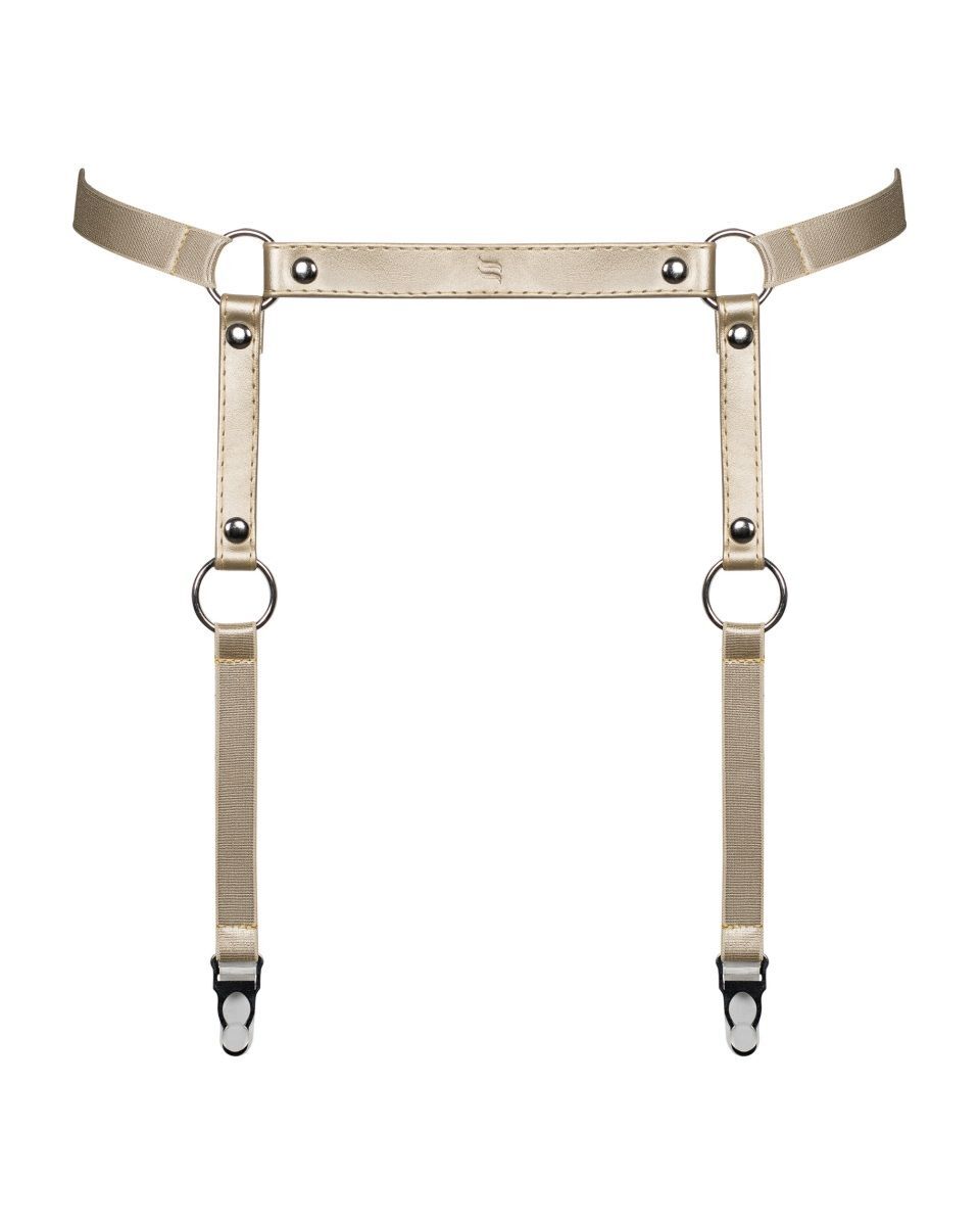 Пояс для эротических игр выполнен из ремней, регулируемых по длине, эластичных резинок и металлических колец.