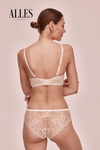 Бюстгальтер Sublime P-UP выполнен на основе бюста CHITA P-UP, на косточках (на каркасах), с дополнительными боковыми поддержками, чашки шитые на тонком поролоне телесного цвета, со съёмными пуш-ап вкладышами, внешняя сторона чашки и спинка из роскошного кружева с цветочным узором, пояс кружевной, продублирован эластичной сеткой. Бретельки не отстёгиваются, регулируются по длине. На спине застёжка на удлинитель, количество крючков в ряду застёжки, увеличивается пропорционально размеру бюстгальтера, фурнитура металлическая цвета меди. Между чашек украшение в виде подвески и атласной ленточки. Бюстгальтер идеально сочетается с трусиками Sublime.