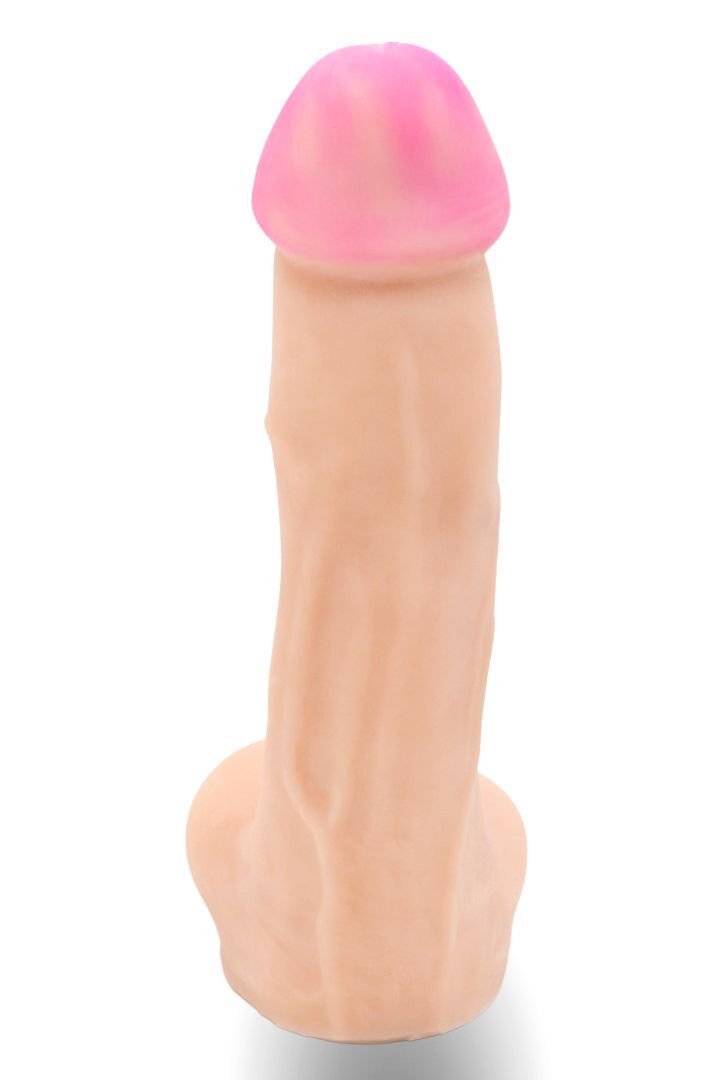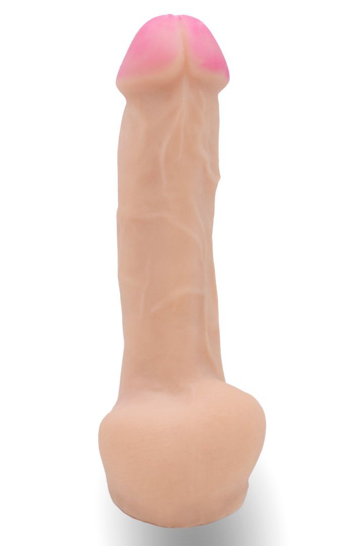 Это распространенный размер, подходящий большинству рожавших женщин. Реалистик имеет изгиб. За счет этого его можно вращать на бобышке, менять направление и даже ласкать мошонкой клитор. Имеет характеристики эрегированного мужского пениса. Рабочая длина - 18,5 см. Диаметр головки - 4 см.
