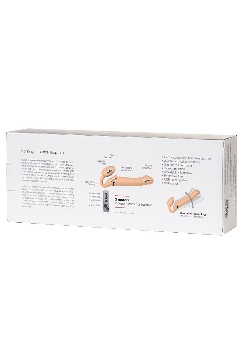 Откройте новые возможности для выражения своих чувств и желаний вместе с безремневым полуреалистичным вибрострапоном Strap-on-me. Обещаем, вы будете в восторге от переполняющих эмоций. Идеально выверенная форма с регулируемой технологией подстроится под любые анатомические особенности обоих партнеров и запомнит оптимальное для вас положение. Активную участницу впечатлит крепление страпона, которое не только надежно фиксирует игрушку, но и дополнительно стимулирует ее G-точку и клитор. Пассивный партнер оценит гибкий ствол Strap-on-me, который мастерски массирует точки G или P-spot. Чтобы удовольствие было максимально захватывающим, включите вибрацию. 3 мощных независимых мотора, встроенных в корпус игрушки, познакомят вас с незабываемым наслаждением. Один мотор пробудит волнами вибрации эрогенные точки принимающей стороны, а два других мотора уделят особое внимание вагине и клитору активной партнерши. Вы сможете экспериментировать с тремя режимами вибрации и тремя скоростями, подключать все моторы сразу или по отдельности, управлять игрой с помощью пульта ДУ — теперь количество сценариев для ваших интимных сессий с одновременным оргазмом близко к бесконечности. Регулируемая технология. Три независимых мотора с уровнем шума до 50–60 дБ. Емкий аккумулятор на 45 минут непрерывного использования. Пульт ДУ с радиусом работы до 10 метров. 3-слойный материал: гибкий внутренний стержень, жесткий силиконовый слой и дополнительный верхний слой из гипоаллергенного, бархатистого на ощупь силикона Soft-touch. Ручное литье без швов и класс водонепроницаемости IPX7. Мешочек для хранения в комплекте. Strap-on-me — новый уровень вашей близости. Рабочая длина - 15,6 см. Диаметр вагинальной пробки - 3,5 см.