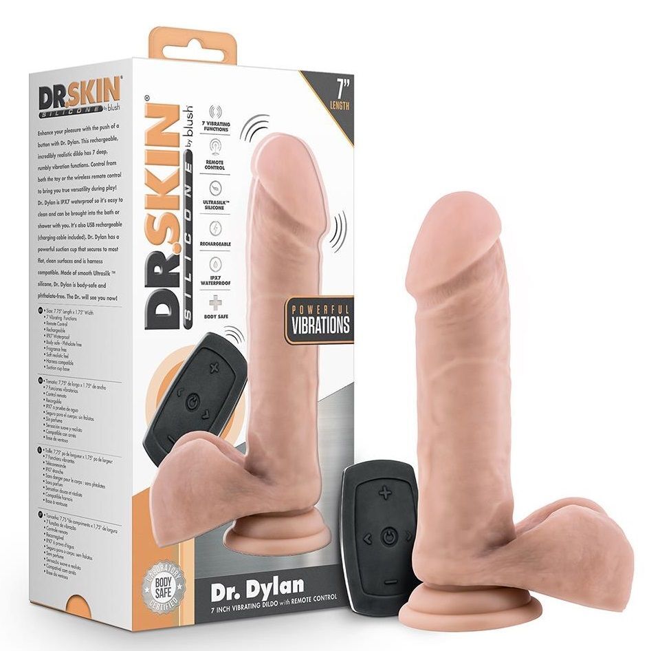 Вибромассажер-реалистик Dr. Dylan 7.5 Inch Vibrating Dildo with Remote Control на присоске. Этот перезаряжаемый, невероятно реалистичный фаллоимитатор имеет 7 ультра-громких вибрационных функций. Управляйте им с помощью беспроводного пульта дистанционного управления. Dr. Dylan водонепроницаем по стандарту IPX7. Он также заряжается от USB с помощью магнитной зарядки (кабель для зарядки входит в комплект). Рабочая длина - 15,2 см.
