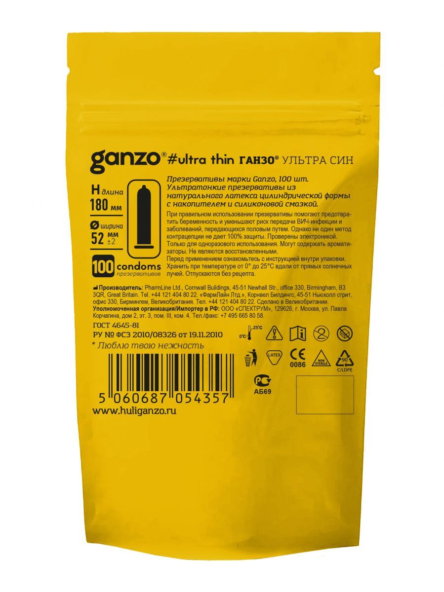Прозрачные презервативы Ganzo Ultra thin цилиндрической формы с накопителем, силиконовой смазкой и супер тонкими стенками для более естественных ощущений. Изготовлены из натурального высококачественного латекса. Проверены с использованием электростатической технологии для большей надежности. Толщина стенки - 0,049 мм. Ширина - 52+/-2 мм. В упаковке - 100 шт.
