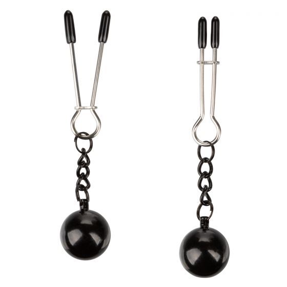 Nipple Grips Weighted Tweezer Nipple Clamps - регулируемые зажимы на соски в виде прищепок с украшением в виде черной бусины на цепочке. Они изготовлены из не содержащего никеля железа. Кончики зажимов оснащены мягкими, удобными подушечками из ПВХ. Силу их сжатия можно регулировать при помощи специальной удавки. Зажимы предназначены не только для украшения, но и стимуляции одной из самых эрогенных зон на теле человека, для интимного возбуждения, а также для длительной эротической игры. С помощью цепочки вы можете дополнительно простимулировать соски, сделав их более восприимчивыми к ласкам.