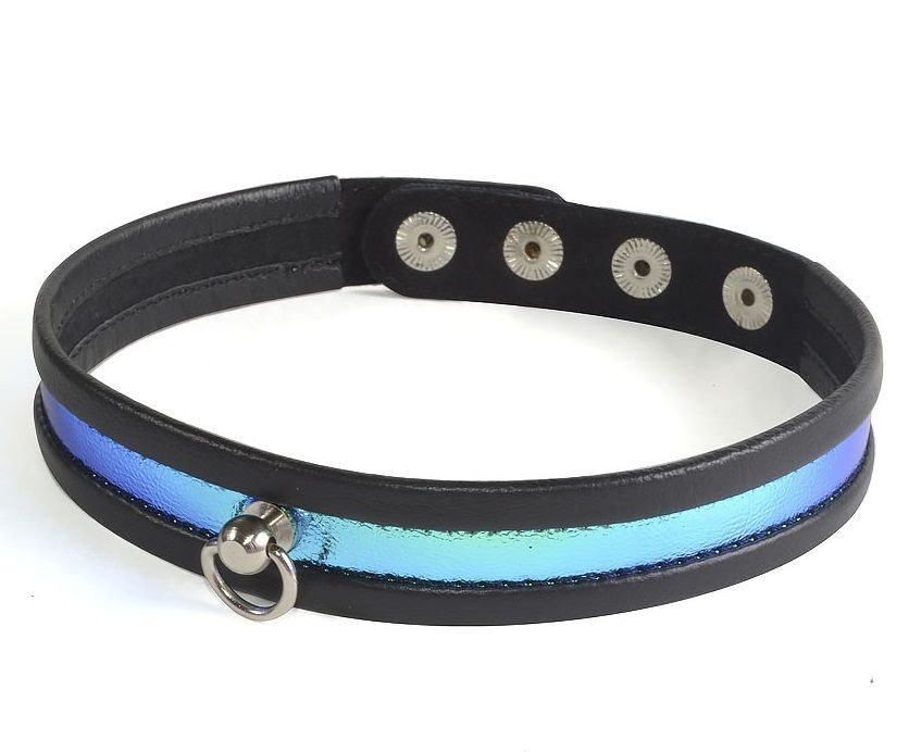 Узкий ошейник из высококачественной натуральной кожи, украшенный вставкой из особого голографического материала цвета хамелеон, является атрибутом подчинения для эротических ролевых игр и практик БДСМ. По краю ошейника проходит оторочка из черной натуральной высококачественной кожи, обеспечивающая комфорт при ношении. На внешней части имеется небольшое D-образное колечко, за которое можно зацепить поводок (в комплект не входит). Ширина - 2 см.