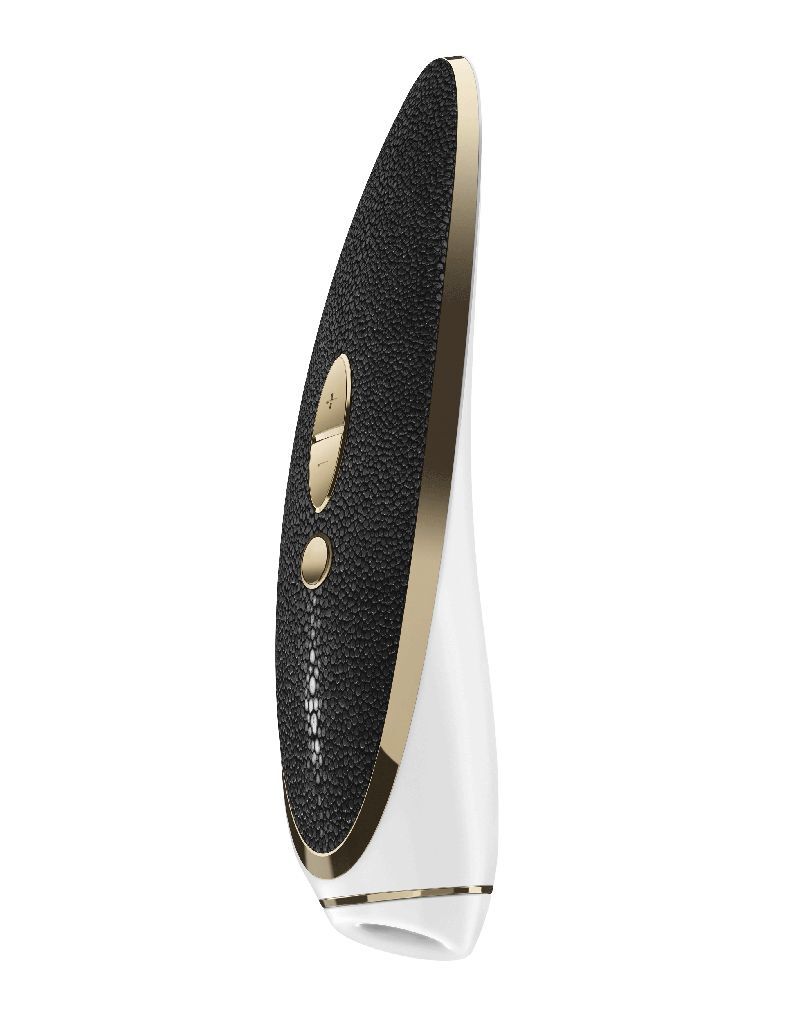 Satisfyer Luxury Haute Couture – элегантный перезаряжаемый инновационный клиторальный стимулятор, сочетающий в себе вакуумно-волновое воздействие и вибрацию. В отделке игрушки используется материалы высшего качества: натуральная кожа и покрытие из золота. Идеальный стимулятор для стимуляции клитора за счет воздействия с помощью вакуума, давления воздухом и вибрации. 11 режимов волновой пульсации и 10 мощной вибрации. Ультрамягкое кольцо из мягкого и шелковистого медицинского силикона обеспечит приятное соприкосновение с кожей и плотное прилегание. Удобное управление позволяет использовать все функции по-отдельности. Эргономичная форма позволит комфортно удерживать стимулятор в руке. Рекомендация от производителя: использовать вначале именно вакуумно-волновое воздействие и только затем вибрацию. Размеры насадки - 5,3 х 4 см. Важно! Девайс не является водонепроницаемым! Использование его в ванной или под душем недопустимо!