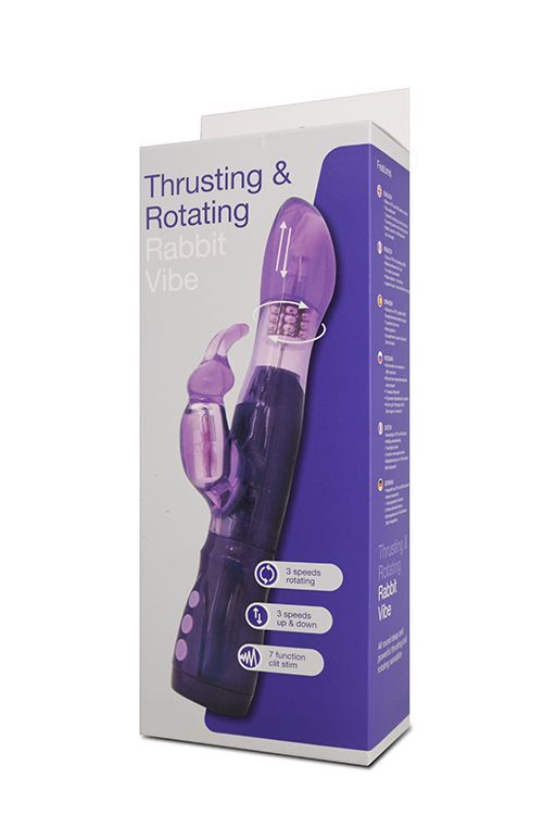 Фиолетовый вибратор с ротацией бусин, клиторальным отростком и возвратно-поступательными движениями THRUSTING & ROTATING RABBIT VIBE. 7 режимов работы клиторального зайчика, 3 режима вращения бусин, 3 скорости возвратно-поступательных движений головки. Водонепроницаемый.