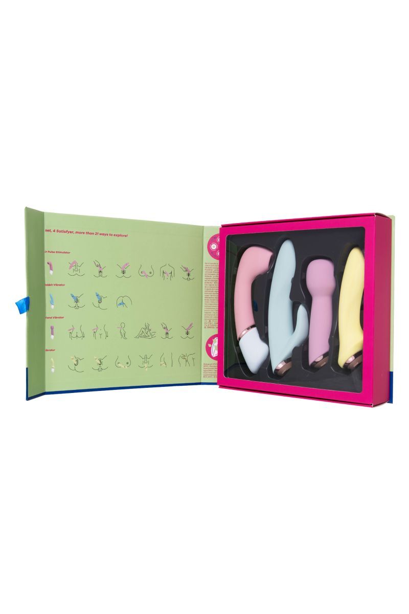 Marvelous Four – это фантастический набор из четырех топовых девайсов для сексуальных радостей: вакуум-волновой стимулятор с увеличенным раструбом, массажер-ванд, классический вибратор и вибратор-кролик. Великолепная четверка Marvelous Four от знаменитого бренда Satisfyer станет персональным проводником в мир удовольствия и наслаждения. С этим набором легко познавать возможности своего тела и партнера. Аккумулятор находится в основании, на котором фиксируются сменные насадки, каждая насадка имеет мощный мотор и 12 режимов вибрации. Вибратор-кролик с двумя моторами позволит ощутить всю прелесть стимуляции зоны G и клитора. Классический вибратор и массажер-ванд обладают такой же глубокой проникающей вибрацией, способной расслаблять мышцы тела и снимать напряжение. Вакуум-волновой стимулятор имеет расширенный раструб, что позволяет стимулировать не только клиторальную зону, но и область сосков и головки полового члена. Marvelous Four предлагает попробовать вместе с партнером всевозможные виды стимуляции: клиторальную, вагинальную и анальную, а также массаж тела и эрогенных зон. Время работы - 60 минут. Перезаряжаемый аккумулятор через USB-кабель, время зарядки - 3 часа. Рабочая длина насадки-кролика - 12,5 см., диаметр - 3,5 см. Рабочая длина классической насадки - 11 см. Длина wand-насадки - 13 см.