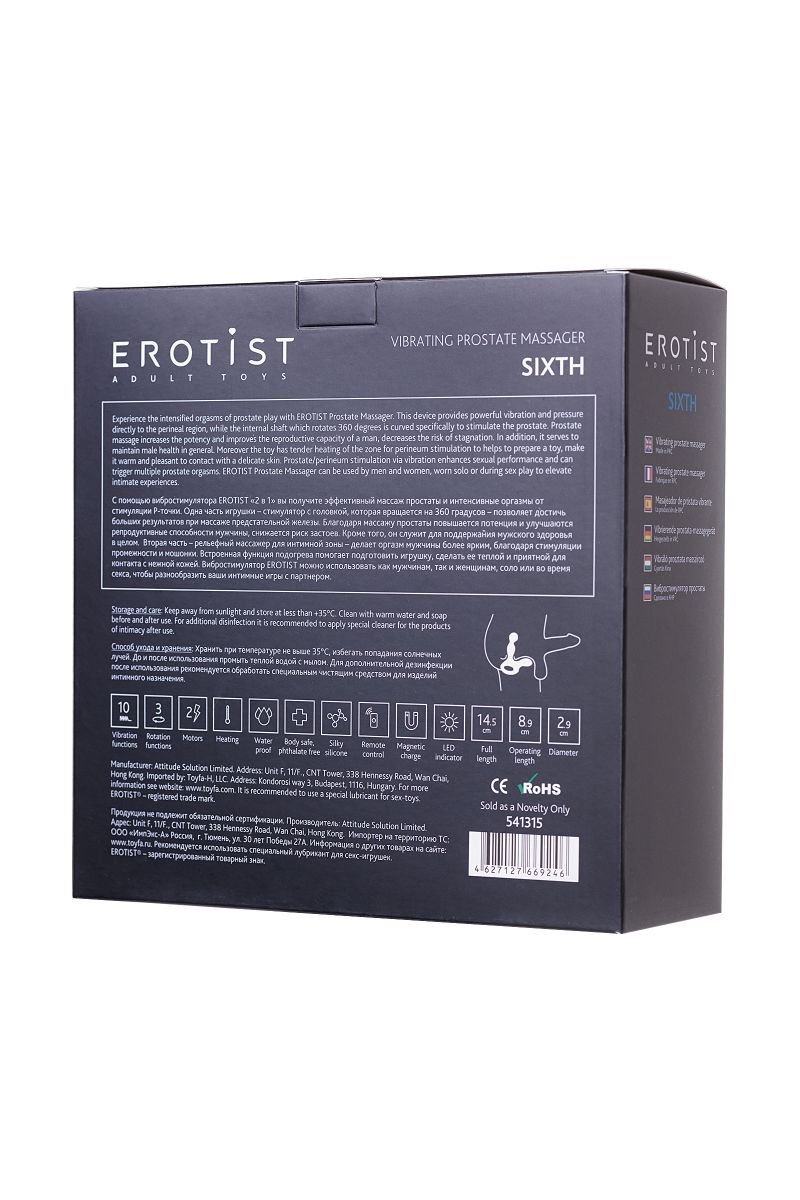С помощью вибростимулятора EROTIST вы получите эффективный массаж простаты и интенсивные оргазмы от стимуляции P-точки. Одна часть игрушки — стимулятор с головкой, которая вращается на 360 градусов — позволяет достичь больших результатов при массаже предстательной железы. Вторая часть — рельефный массажер для интимной зоны — делает оргазм мужчины более ярким, благодаря стимуляции промежности и мошонки. Встроенная функция подогрева помогает подготовить игрушку, сделать ее теплой и приятной для контакта с нежной кожей. Вибростимулятор EROTIST можно использовать как соло, так и во время секса, чтобы разнообразить ваши интимные игры с партнером. Пульт на магнитной зарядке. Рабочая длина - 8,5 см.
