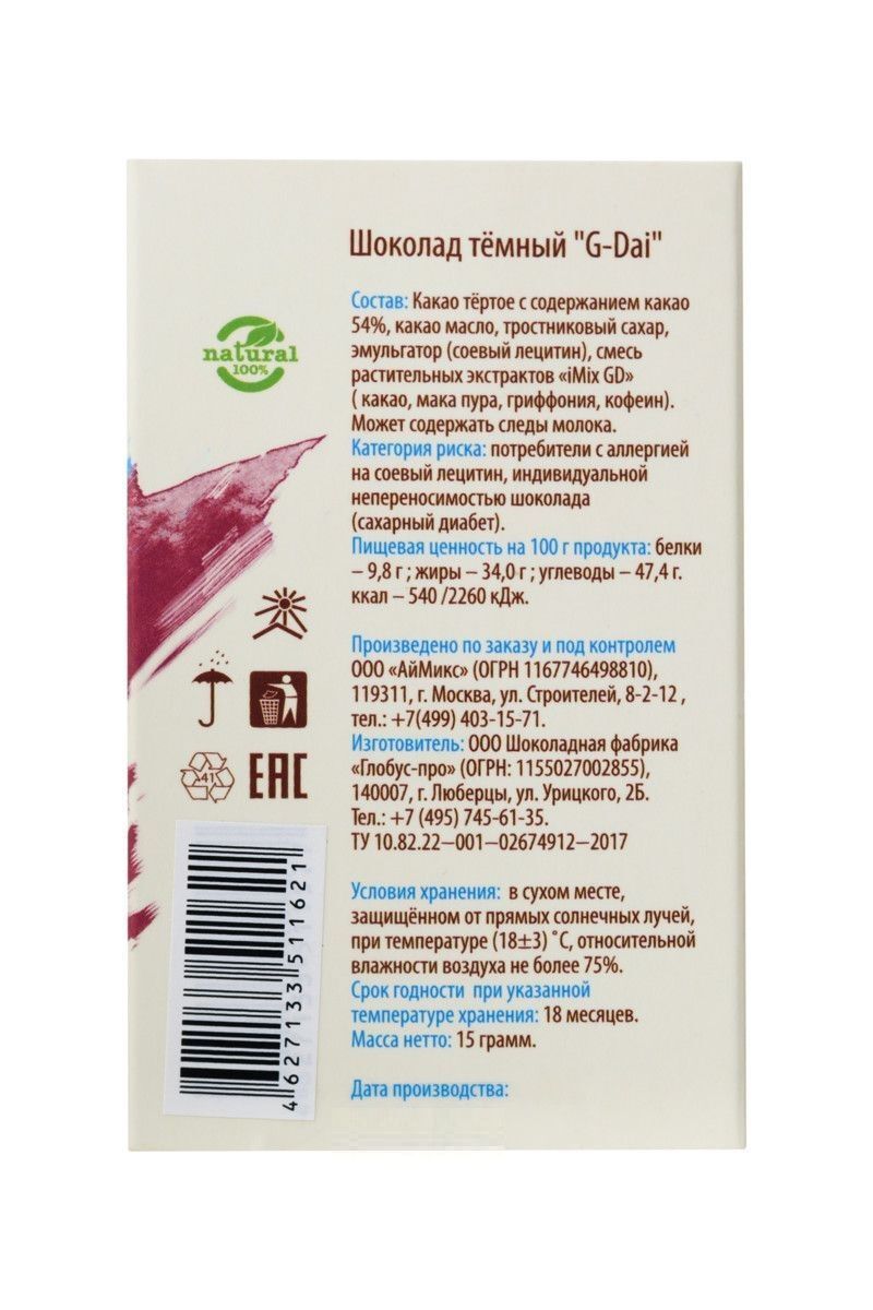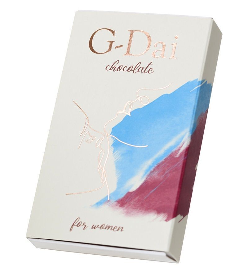 В составе шоколада G-Dai - темный шоколад Barry Callebaut (содержание какао 54%) и комплекс растительных экстрактов iMix GD. В этом шоколаде применена новая формула сочетания активных веществ, благодаря которой удалось добиться не только последовательного и пролонгированного действия афродизиаков, но и избирательности воздействия на мужчину и женщину. Кроме того, данный купаж афродизиаков наиболее гармонично сочетается со вкусом бельгийского шоколада. Шоколад G-Dai for women: - настраивает на удовольствие - повышает либидо - способствует более ярким ощущениям во время секса. Достигается это благодаря содержащимся в его составе экстрактам афродизиаков – гриффонии, маки перуанской, семян какао. Гриффония «запускает» гормон счастья – серотонин, мака усиливает влечение, а экстракт семян какао делает мир цветным и сказочно прекрасным! Гриффония простолистная (или Бандейра простолистная, лат. Griffonia simplicifolia) представляет собой кустарник, используемый в традиционной народной медицине западной Африки. Местное население применяет семена гриффонии в качестве мощного афродизиака, стимулирующего эмоциональный и энергетический подъем. Дело в том, что Гриффония является крупнейшим источником вещества 5- гидрокситриптофан (5-НТР). Ее семена содержат до 20% 5-НТР по весу. Наше тело производит 5-НТР из триптофана, другой аминокислоты, найденной в белковых продуктах: мясо, курица, рыба, молочные продукты, бобовые и орехи. После поглощения 5-HTP переступает гематоэнцефалический барьер и превращается в серотонин - нейротрансмиттер, который играет немаловажную роль в регулировании настроения, тревоги, аппетита и сна. Может вызвать ощущение радости или даже сильной эйфории. Неудивительно, почему он называется «гормоном счастья». При стрессах, тревоге, эмоциональных расстройствах возникает дефицит серотонина, поскольку большая часть триптофана метаболизируется в другие соединения, а еще меньше поступает в организм при несбалансированном употреблении белков и углеводов. При этих условиях триптофан недоступен для биосинтеза серотонина, а вот для 5-гидрокситриптофана таких проблем не существует. 5-НТР хорошо абсорбируется сублингвально, т.е. в ротовой полости. И шоколад хорошо этому способствует. Мака перуанская – это известный многим сильный афродизиак. Обилие минералов, жирных кислот, присутствие цинка, йода позволяет нормализовать баланс половых гормонов, повысить настроение, усилить сексуальное возбуждение. Экстракт какао относится к биологически активным соединениям, которые содержатся в какао-продуктах. Эти соединения включают флавонолы, процианиды и эпикатехин. Хотя эти молекулы содержатся не только в какао, экстракт какао содержит особенно высокие уровни эпикатехина по сравнению с другими растительными продуктами. Употребление эпикатехина увеличивает выработку оксида азота, молекулы, которого расширяют кровеносные сосуды и улучшает кровоток. Не рекомендуется употреблять шоколад при следующих состояниях: - аллергия на шоколад - сахарный диабет - нестабильная стенокардия - гипертонические кризы - перевозбуждение - бессонница.