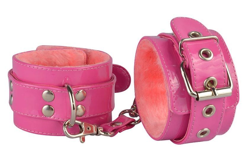 Яркие наручники из искусственной лаковой кожи розового цвета. Внутренняя сторона изделия отделана мягким искусственным мехом. Соединяются наручники при помощи перемычки с двумя карабинами. Длина манжет - 30 см. Ширина - 5,5 см.