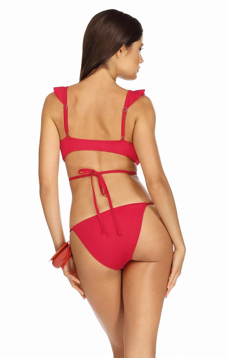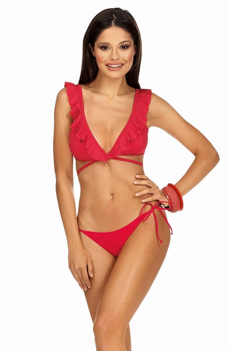Купальник раздельный для девушки. Бюстгальтер мягкий, со съемными эластичными вкладышами, тонкие бретели на чашках перекрещиваются на запах, завязываются на спине, бретели регулируются по длине. Трусики-слип на стрейч-подкладке с линией талии ниже среднего, по бокам тонкие завязки. В комплекте: лиф, трусики. Внимание: европейские размеры! См. размерную сетку производителя.