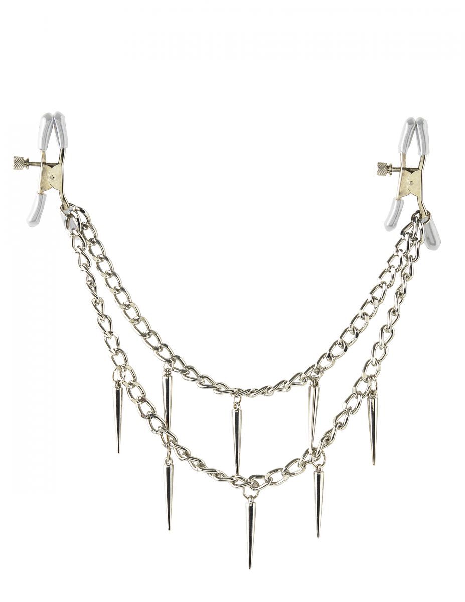 Стильные зажимы для сосков станут не только оригинальным аксессуаром, украшающим женскую грудь, но и отменным стимулятором этой чувственной эрогенной зоны, которая требует особых изысканных ласк. Интимное изделие состоит из серебристой 30-сантиметровой цепочки, украшенной острыми и длинными шипами, добавляющими образу дерзости и некой агрессивности, и самих зажимов. Зажимы для сосков имеют силиконовое покрытие внутри, исключающее травмы и трещины этой нежной зоны, и регулятор интенсивности зажатия, ведь чувствительность у всех разная. Пикантные эксперименты в постели, ощущение сладкой боли, перерастающее в интенсивное удовольствие, обеспечит это интимное изделие.