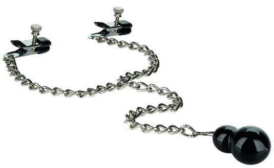 Weighted Dual Tier Nipple Clamps - регулируемые двухуровневые зажимы на соски в виде прищепок и с утяжелителем. Цепочка и зажимы изготовлены из железа. Кончики зажимов оснащены мягкими, удобными подушечками из поливинилхлорида. Силу их сжатия можно регулировать при помощи специальных винтов. Зажимы декорированы изящной декоративной подвеской. Зажимы предназначены не только для украшения, но и стимуляции одной из самых эрогенных зон на теле человека, для интимного возбуждения, а также для длительной эротической игры. Под воздействием давления соски становятся более восприимчивыми к ласкам. Помимо сжатия, добавленный вес увеличивает чувственную стимуляцию и усиливает чувствительность сосков. Длина зажима - 4,5 см.