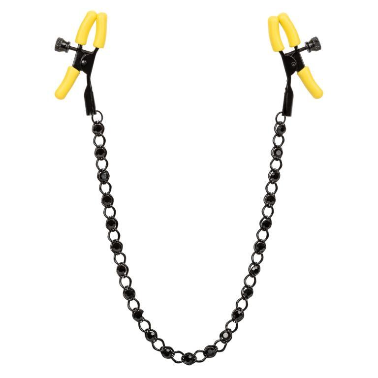 Nipple Teasers - регулируемые зажимы на соски в виде прищепок с цепочкой, в звеньях которой вставлены черные кристаллы. Они изготовлены из не содержащего никеля железа. Кончики зажимов оснащены мягкими, удобными подушечками из силикона. Силу их сжатия можно регулировать при помощи специальных винтов. Длина цепи - 30,5 см. Длина зажима - 5,75 см.