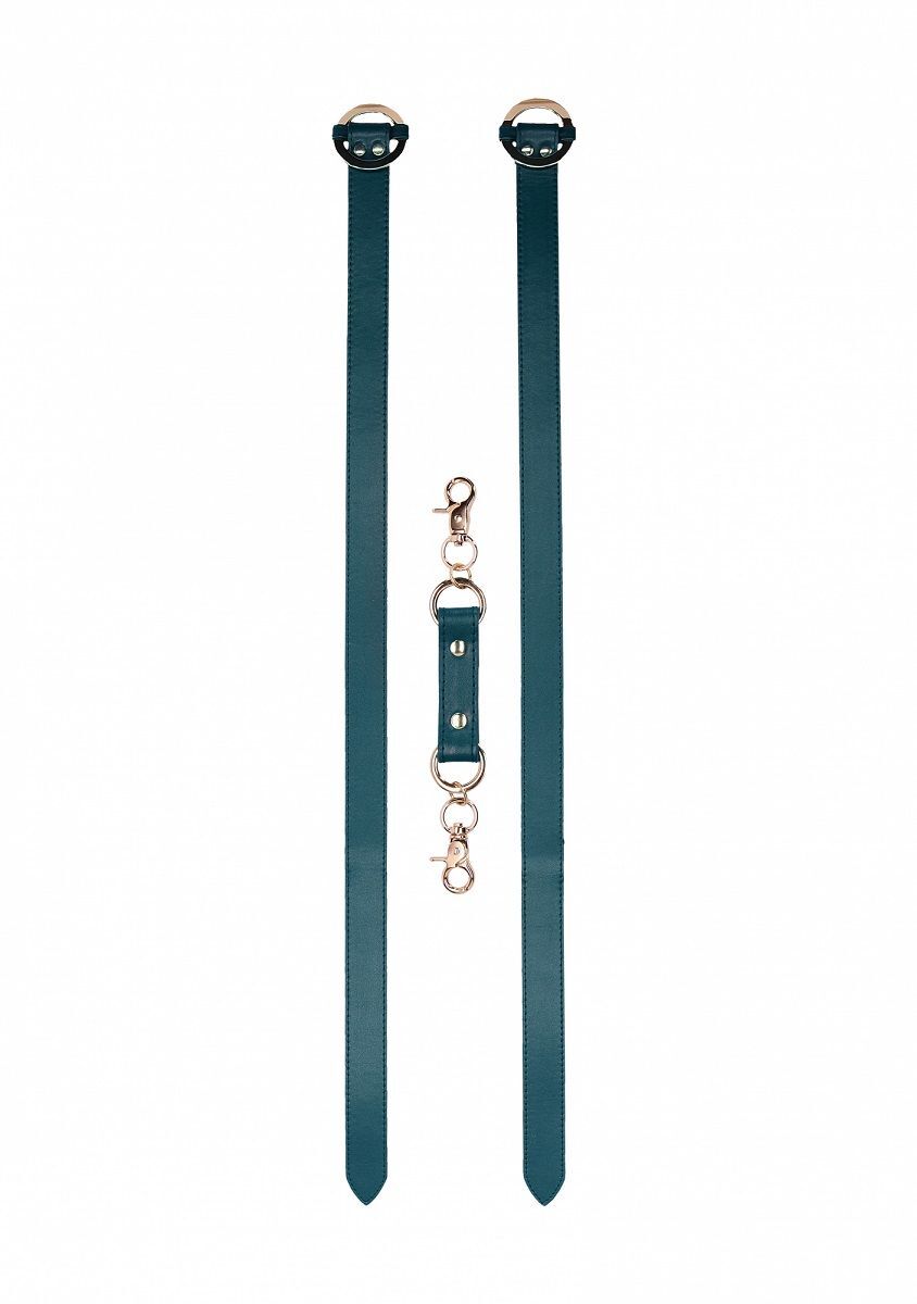 Thigh Cuffs - кожаные наножники с цепочкой, предназначенные для ограничения свободы движения партнера во время эротических игр, а также в БДСМ практиках. Выполненные в элегантном цвете, оковы декорированы металлическими золотыми кольцами, которые являются не только красивым элементом декора, но и к ним с помощью универсальных карабинов присоединяется короткая цепочка, чтобы соединять их между собой. Длина ремней - 75,5 см., ширина - 5,1 см.