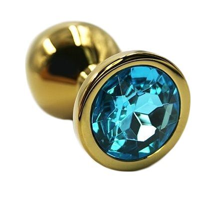Золотая анальная пробка из алюминия размер S. Страз в основании круглой формы, выполнен из стекла голубого цвета. Упакована в вельветовый мешочек для хранения. Вес - 52 гр.