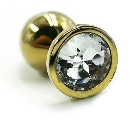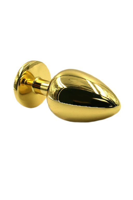 Золотая анальная пробка из алюминия размер S. Страз в основании круглой формы, выполнен из прозрачного стекла. Упакована в вельветовый мешочек для хранения. Вес - 52 гр.