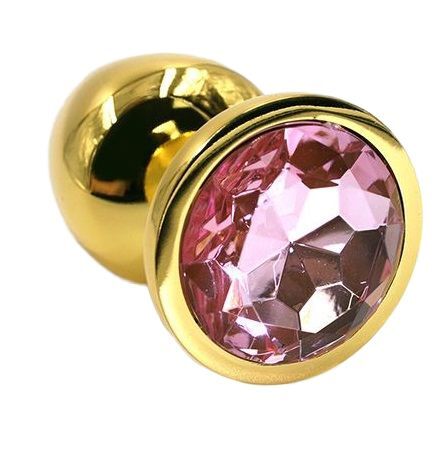 Золотая анальная пробка из алюминия размер S. Страз в основании круглой формы, выполнен из стекла светло-розового цвета. Упакована в вельветовый мешочек для хранения. Вес - 52 гр.