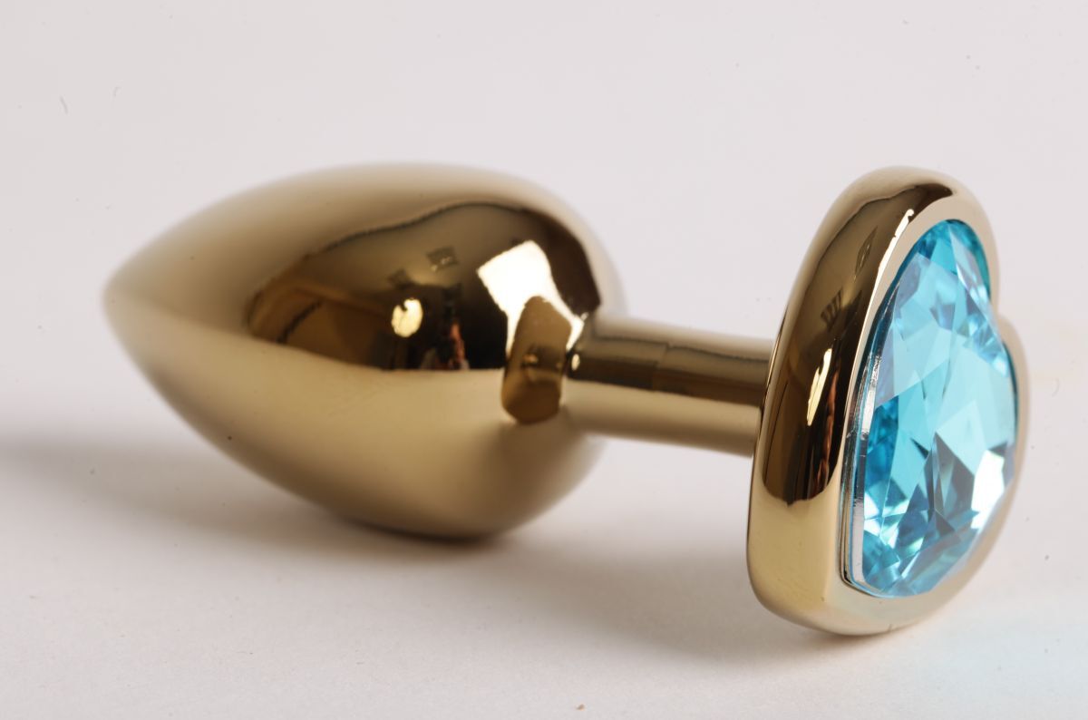 Золотистая анальная пробка с голубым стразиком-сердечком - 7,5 см.