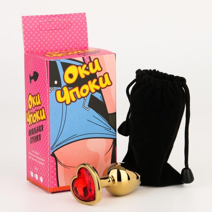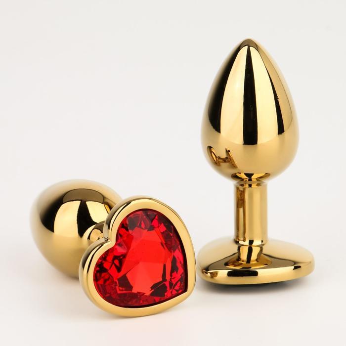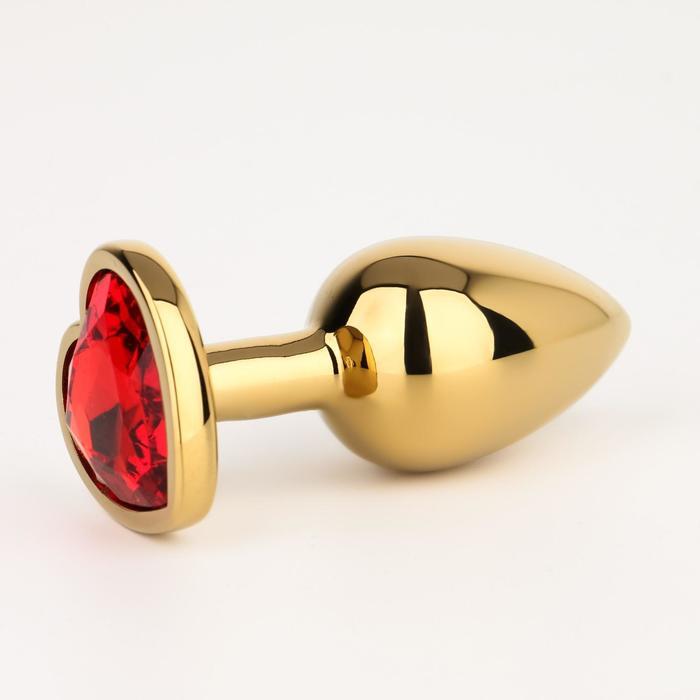 Золотистая анальная пробка с красным кристаллом в форме сердца - 7 см.