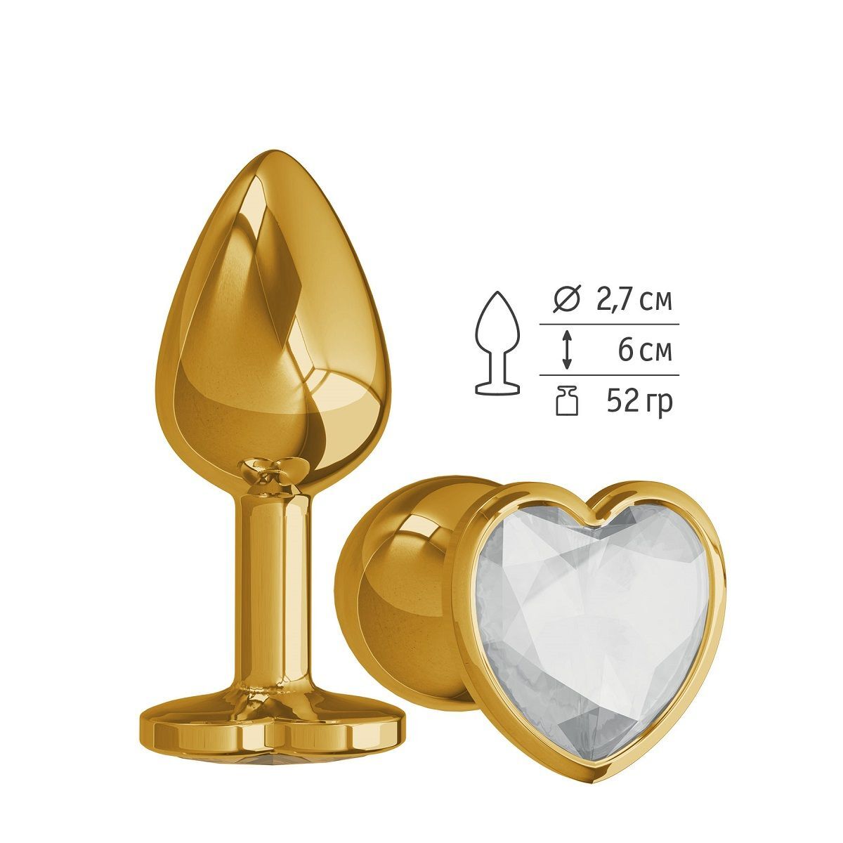 Золотистая анальная втулка с прозрачным кристаллом-сердцем - 7 см.