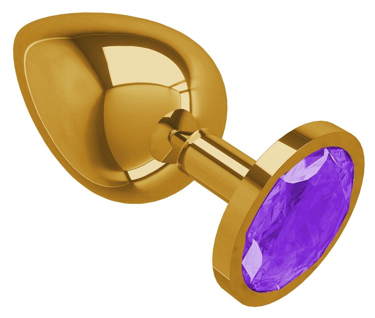 Золотистая большая анальная пробка с фиолетовым кристаллом - 9,5 см.