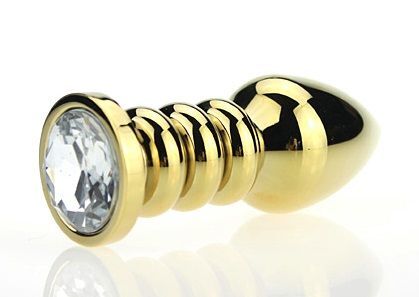 Золотистая фигурная анальная пробка с прозрачным стразом - 10,3 см.