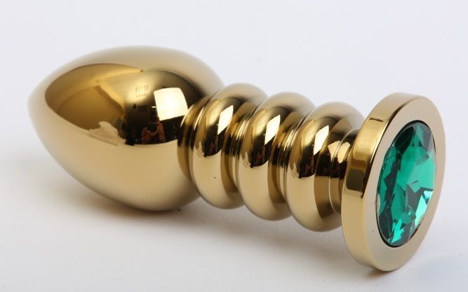 Золотистая фигурная анальная пробка с зелёным стразом - 10,3 см.