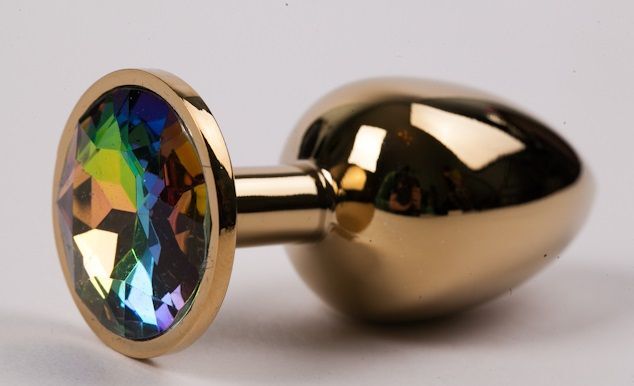 Золотистая металлическая анальная пробка с радужным стразом - 8,2 см.