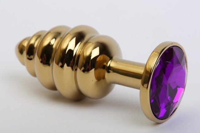 Золотистая ребристая анальная пробка с фиолетовым стразом - 7,3 см.