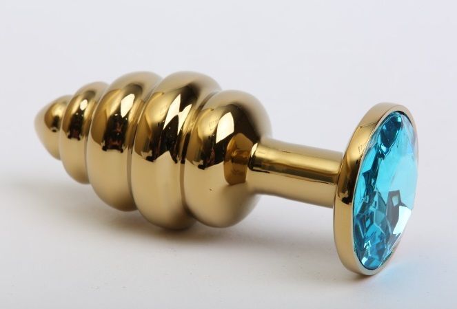 Золотистая ребристая анальная пробка с голубым стразом - 7,3 см.