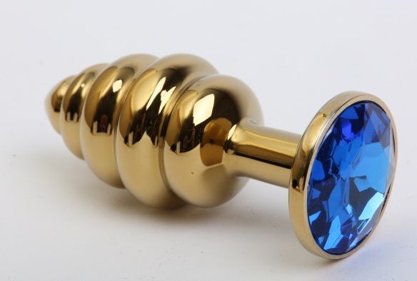Золотистая ребристая анальная пробка с синим стразом - 7,3 см.