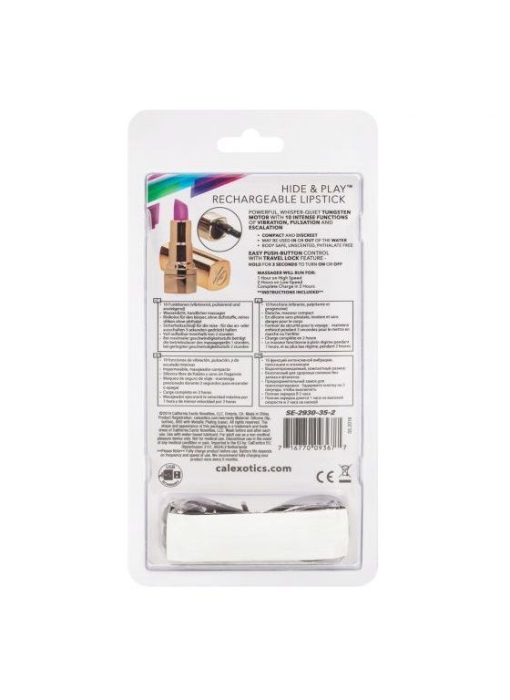 Hide & Play Rechargeable Lipstick – перезаряжаемый мультискоростной миниатюрный вибромассажер, выполненный в виде помады. Корпус изготовлен из гладкого, не содержащего фталатов пластика, покрытого золотистым полиуретановым покрытием, а головка выполнена из мягкого ультра-плюшевого силикона. Бесшумный двигатель вибратора обеспечивает 10 различных функций вибрации, пульсации и эскалации. Компактность, удобство и нейтральная форма делают этот вибромассажер идеальным спутником везде, куда бы ты ни отправилась. Наклонный наконечник предназначен для точечной и клиторальной стимуляции. Игрушка имеет удобное управление одной кнопкой. Чтобы включить или выключить игрушку, необходимо нажать и в течение трех секунд удерживать кнопку питания. Вибромассажер заряжается через USB и может быть подключен практически в любом месте, просто подсоедините идущий в комплекте шнур к совместимому порту компьютера или USB-адаптера (приобретается отдельно), а противоположный конец со штекером к игрушке. Полная зарядка занимает 2 часа, ее достаточно для беспрерывной работы до 2 часов