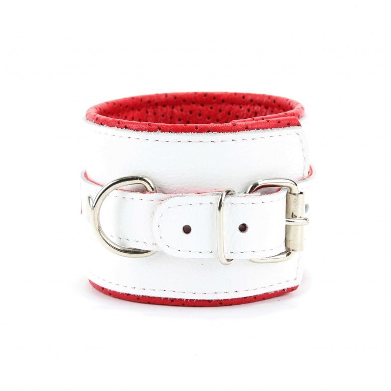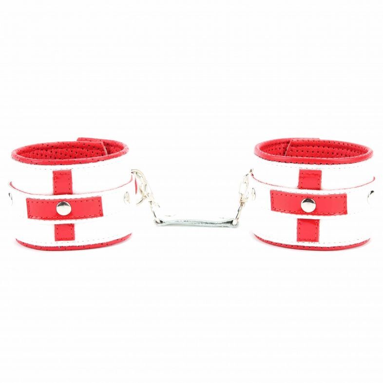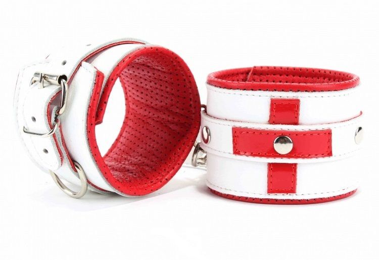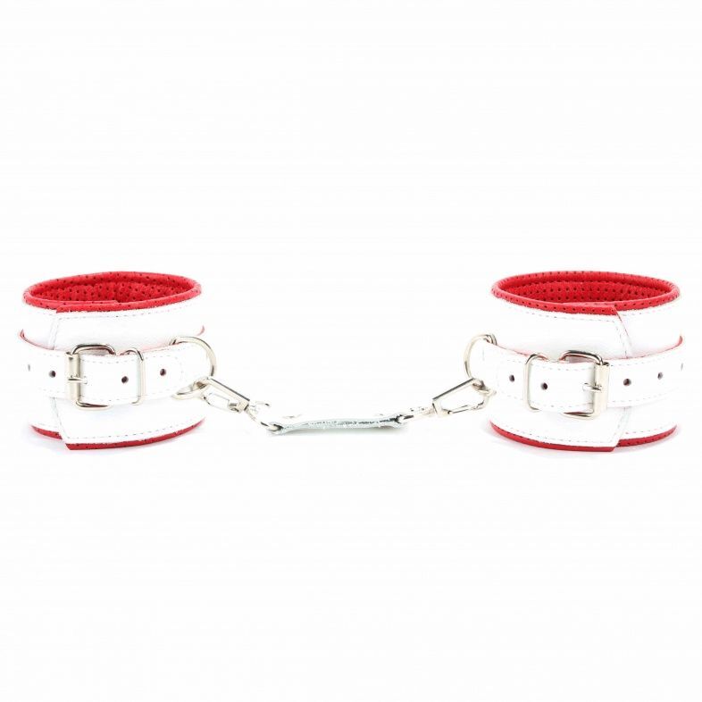 Наручники выполнены из натуральной гладкой кожи белого цвета с ярко-красными лаковыми крестами. Ремни позволяют выбрать нужный размер, металлическая пряжка крепко удерживает в подчинении, кожаное соединение на карабинах фиксирует наручники вместе, подклад из нежной перчаточной кожи с перфорацией обеспечивает комфорт. Возбуждающие воображение наручники помогут воплотить задуманное в реальность. Подойдут на обхват руки от 18 до 25см. Ширина - 6 см. Длина соединения - 15 см.