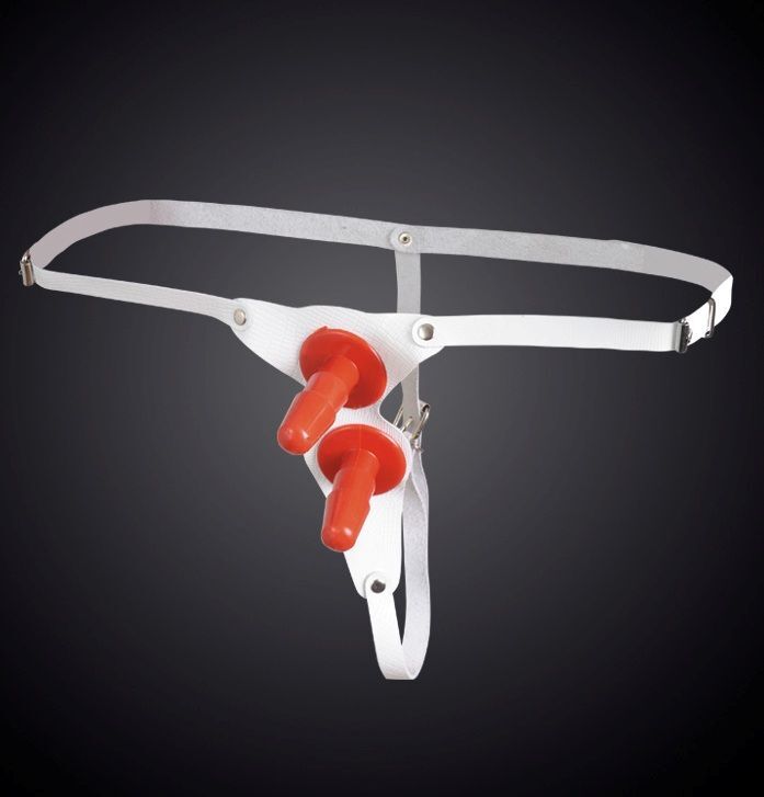 Страпон для двойного проникновения. В комплект входят два съёмных пластиковых плага для насадок. Изготовлен из натуральной кожи и никелированной фурнитуры. Размер универсальный.