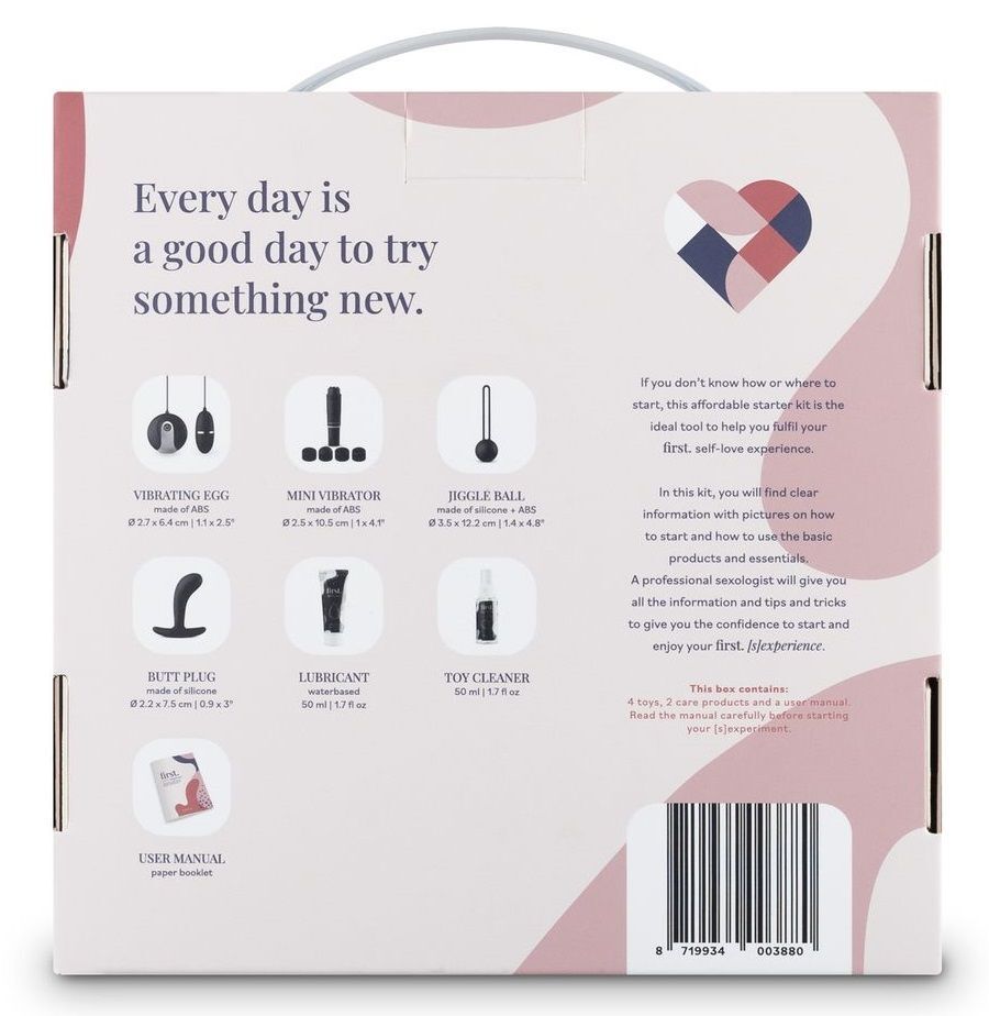 Стартовый набор First Self-Love Experience - идеальный набор для начинающих для женщин, которым интересно использовать разные виды игрушек, но практически нет опыта. Но коробочка также станет приятным дополнением для семейной пары для увлекательного вечера в спальне. Удивительное содержание предлагает множество вариантов и множество возможностей узнать свое тело еще лучше! В коробке есть вибрационное яйцо с дистанционным управлением, мини-вибратор с 4 насадками, джингл-шар, анальная пробка, лубрикант на водной основе и флакон для чистки игрушек. Все игрушки изготовлены из безопасного для тела материала и удобны в использовании. Обширное и откровенно написанное руководство (на английском языке) изобилует объяснениями, что можно и чего нельзя делать, и вселяет в вас достаточно уверенности, чтобы начать это новое путешествие. В комплекте: виброяйцо, мини-вибратор с насадками, вагинальный шарик, анальный плаг, лубрикант, спрей для очистки игрушек, инструкция по эксплуатации. Длина виброяйца - 6,4 см., диаметр - 2,7 см. Батарейки в комплекте. Длина мини-вибратора - 10,5 см., диаметр - 2,5 см. Батарейки в комплекте. Длина вагинальных шариков - 12,2 см., диаметр - 3,5 см. Длина анальной пробки - 7,5 см., диаметр - 2,2 см.