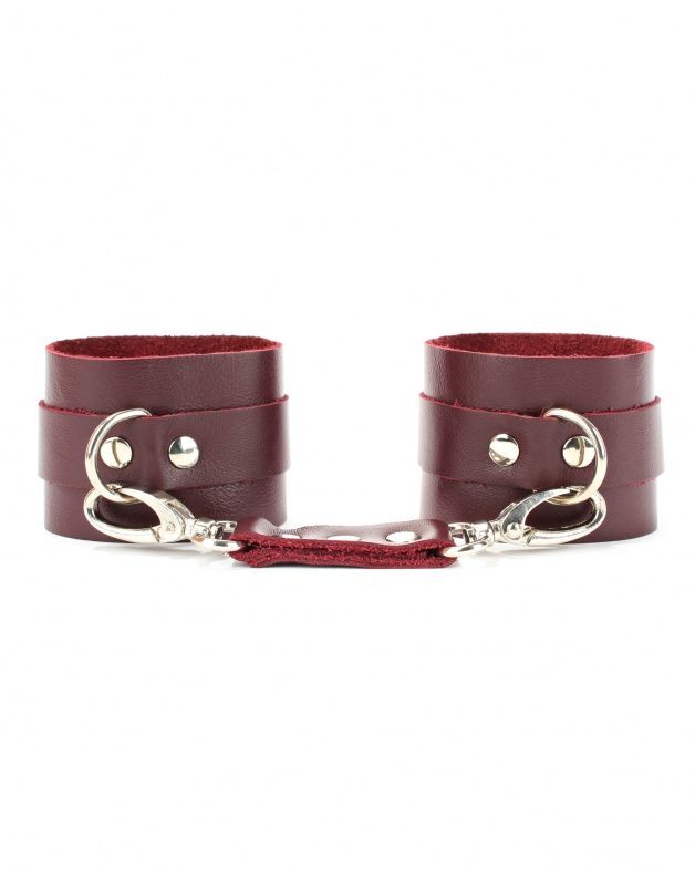 Наручники выполнены из натуральной кожи бордового цвета. Металлическая пряжка крепко удерживает в подчинении, кожаное соединение на карабинах фиксирует наручники вместе. Ремни позволяют выбрать нужный размер, подойдут на обхват руки от 15 до 26 см. Стильный аксессуар поможет воплотить эротические фантазии в реальность. Ширина - 6 см. Длина соединения - 15 см.