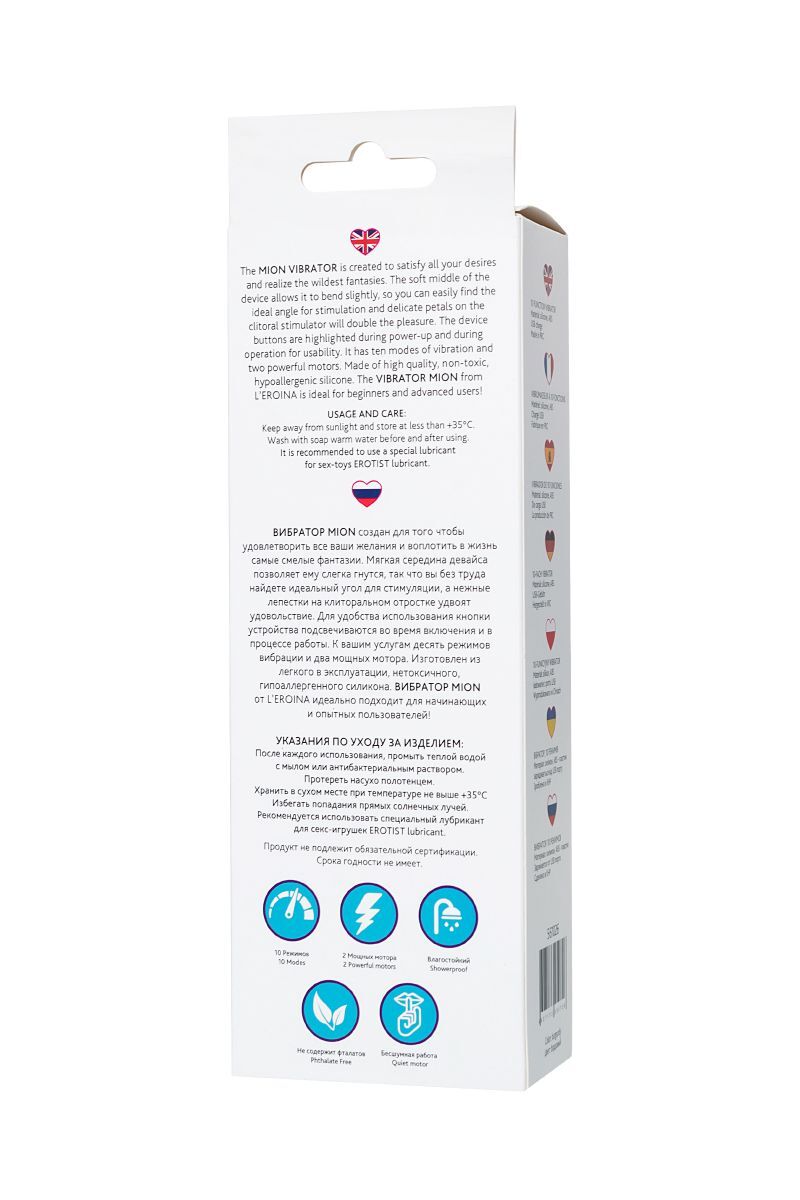 Вибратор Mion создан для того чтобы удовлетворить все ваши желания и воплотить в жизнь самые смелые фантазии. Мягкая середина девайса позволяет ему слегка гнуться, так что вы без труда найдете идеальный угол для стимуляции, а нежные лепестки на клиторальном отростке удвоят удовольствие. Для удобства использования кнопки устройства подсвечиваются во время включения и в процессе работы. К вашим услугам десять режимов вибрации и два мощных мотора. Изготовлен из легкого в эксплуатации, нетоксичного, гипоаллергенного силикона. Вибратор Mion от L’EROINA идеально подходит для начинающих и опытных пользователей! Рабочая длина - 13 см. Диаметр клиторального отростка - 2,3 см.