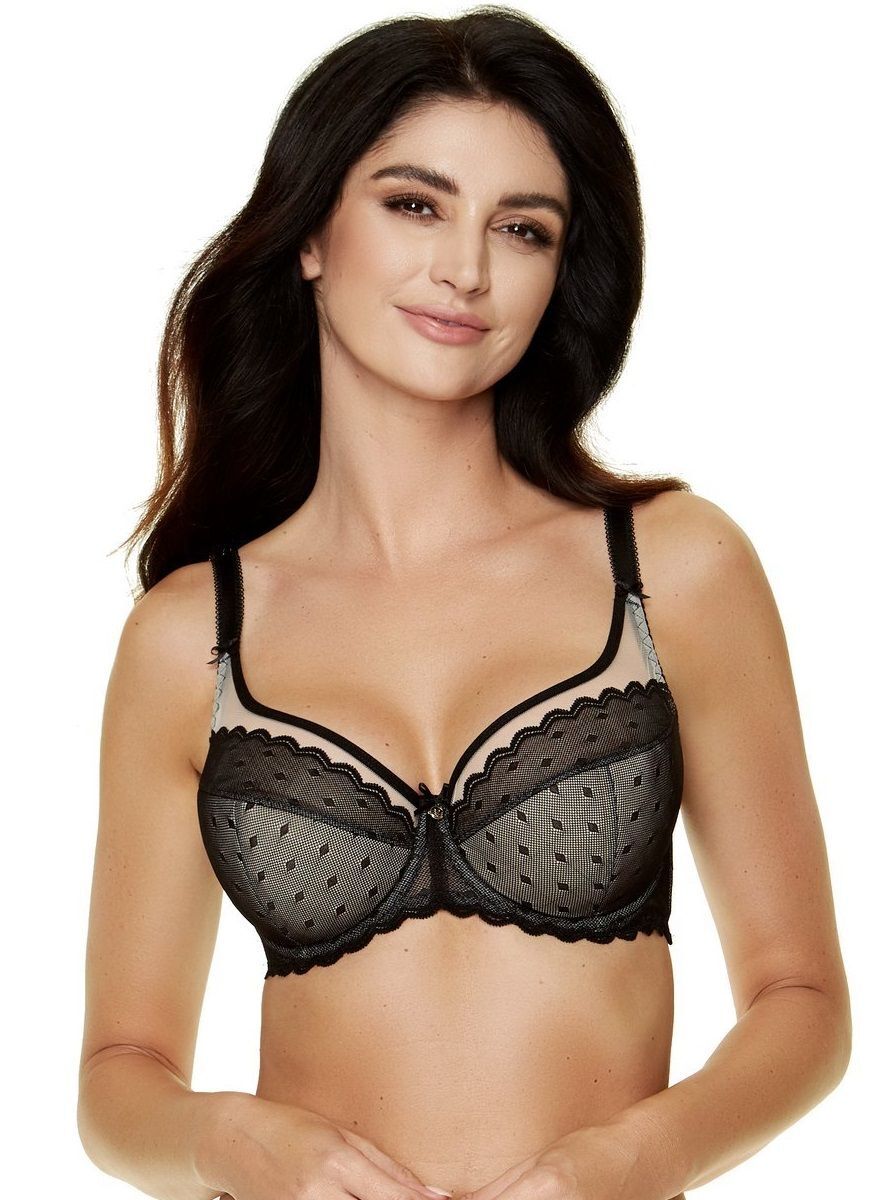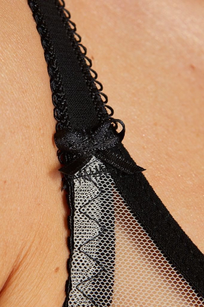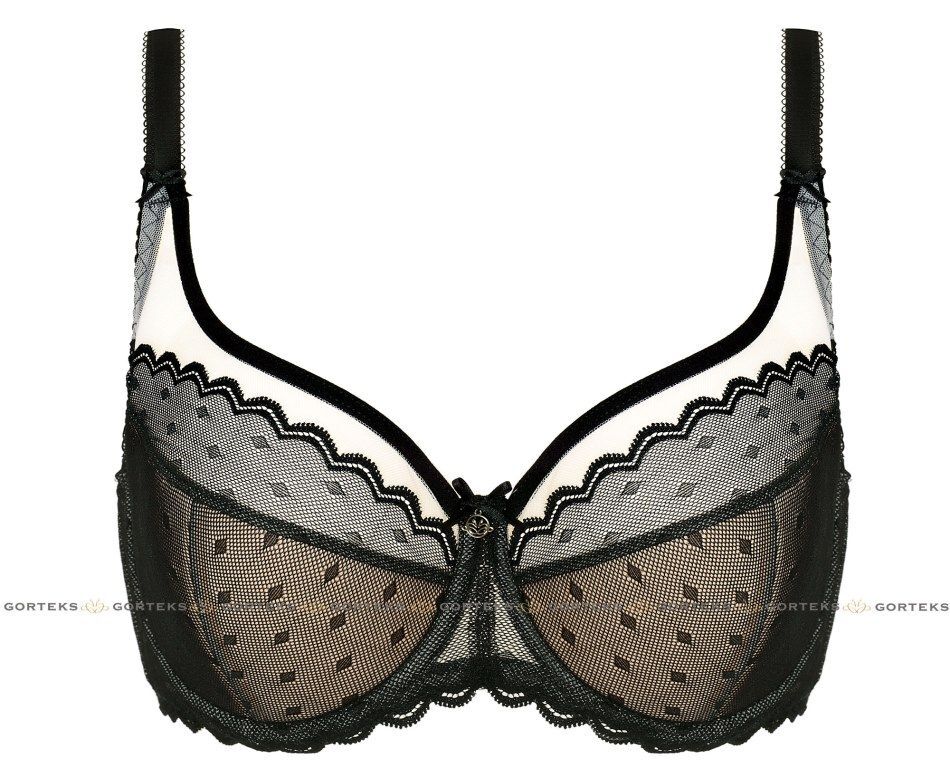 Бюстгальтер Fargo на косточках, с дополнительными боковыми поддержками, чашки шитые, нижняя часть чашек на тонком поролоне телесного цвета, внутренняя сторона проложена хлопковым трикотажем, внешняя покрыта деликатной чёрной сеткой с геометрическим рисунком, верхняя часть чашек и спинка из черной и телесной сетки. Бретельки не отстёгиваются, регулируются по длине, на спине застёжка-удлинитель.