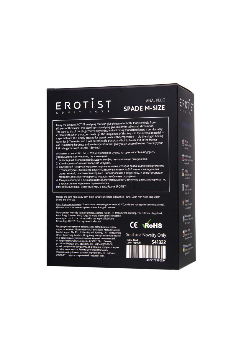 Анальная втулка Spade - это уникальная игрушка, которая способна подарить удовольствие как мужчине, так и женщине. Каплевидная форма дарит комфортную анальную стимуляцию. Узкий скругленный кончик облегчает введение игрушки. 100% водонепроницаемость и мощная присоска в основании позволяют использовать втулку на любых гладких поверхностях, даже в ванной, а также служит надежным ограничителем. Внешний материал - нежный и безопасный силикон, а внутренний материал игрушки сделан из специальной пены, которая позволяет экспериментировать с температурой: опустите втулку в кипяток на 5-7 минут, и она станет мягкой, пластичной и горячей. Положите втулку в морозилку, и ее потрясающая твердость и низкая температура обеспечат необычные ощущения. Добавьте разнообразия и экспериментов в ваши интимные игры с девайсами EROTIST! Рабочая длина - 9 см. Минимальный диаметр - 1,6 см.
