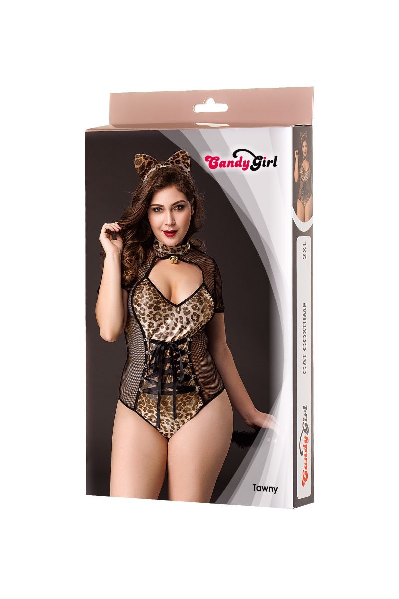 Ушки-ободок и боди хищной кошки с воротником-стойкой, золотистым бубенчиком, глубоким декольте, короткими рукавами и меховым хвостом. Вставки блестящего эластичного трикотажа визуально формируют приталенный силуэт. Талия декорирована темной шнуровкой. Вставки сетки по бокам зрительно обнажают фигуру. В комплекте: боди и ушки.