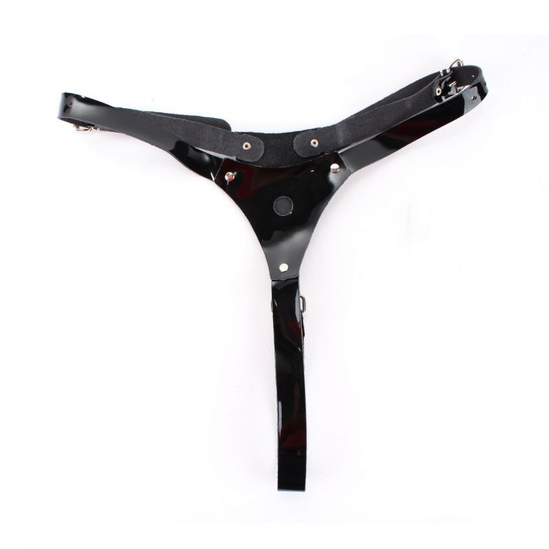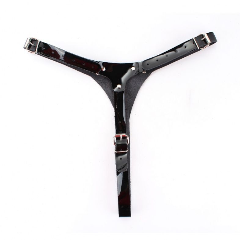 Трусики выполнены из натуральной лакированной кожи черного цвета. Спереди крепится штырек харнесс для насадок (входит в комплект). Изделие фиксируется ремнями и пряжками, позволяющими подобрать нужный размер (S-L). Аккуратные, стильные трусики помогут воплотить задуманное в реальность. Ширина ремешков - 2 см.