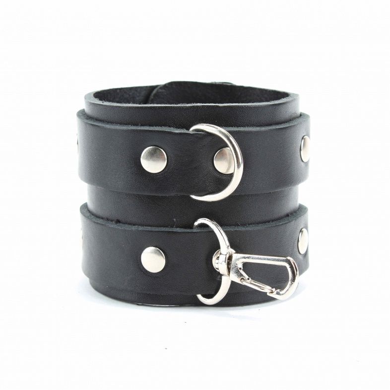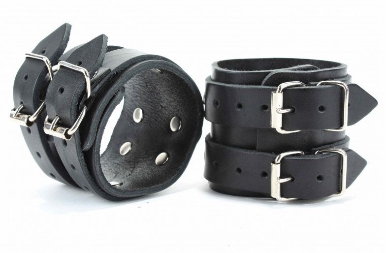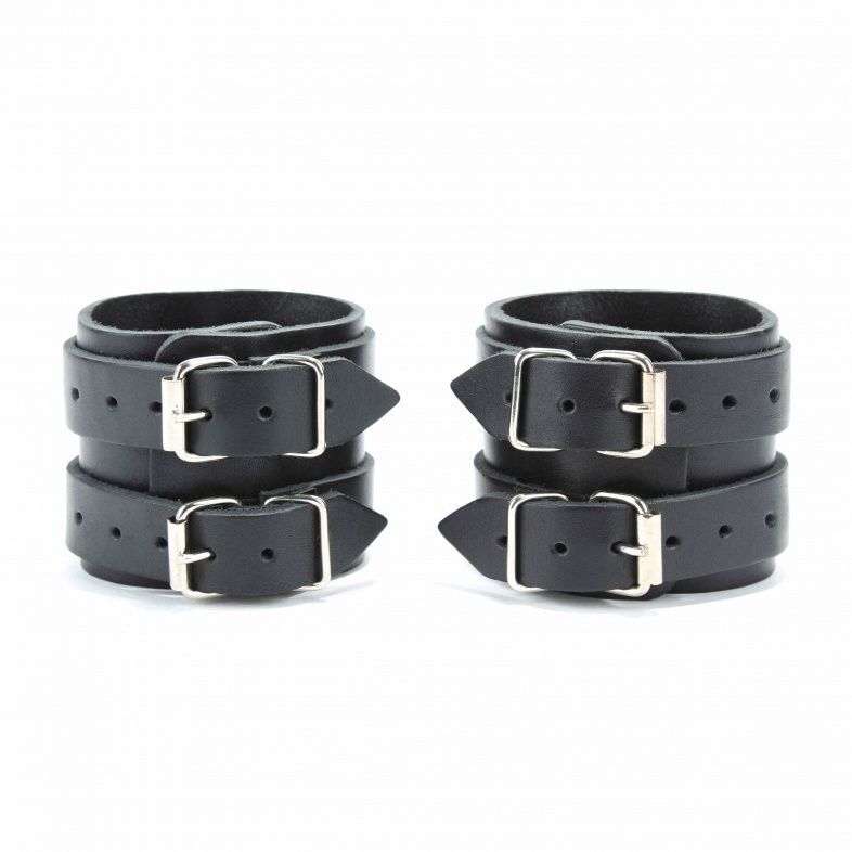 Наручники выполнены из прочной плотной натуральной кожи, надежно фиксируются двумя ремнями с металлическими пряжками. Подойдут на обхват от 19 до 26 см. Аксессуары соединяются двумя карабинами между собой. Наручники для ценителей жесткой и сильной фиксации. Ширина - 7 см. Длина соединения - 15 см.