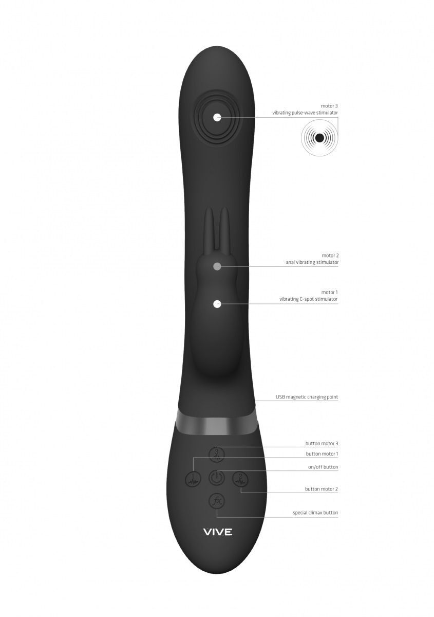 Rini - это инновационный вибратор со стимуляцией всех самых чувствительных точек, разработанный с учетом женской анатомии. Оснащен 3 мощными независимыми моторами: импульсно-волновой в головке для активной стимуляции точки G, вибрационный мотор клиторальном отростке и в анальной цепочке. Имеет пульт управления, комфортно помещается в трусики и подходит для бесконтактных скрытых развлечений. Средний радиус действия пульта 5 метров. Пульт работает от аккумулятора и заряжается той же зарядкой, что и сам вибратор! Изготовлено изделие из шелковистого медицинского гипоаллергенного силикона и как большинство моделей линейки VIVE имеет кнопку мгновенного оргазма, запуская все моторы на максимум одним касанием. Такой вибратор можно брать с собой в ванную и душ. Рабочая длина - 12,2 см.