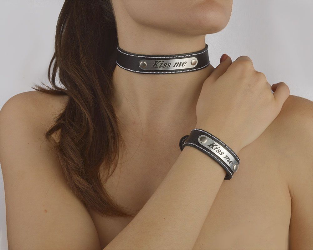 Чокер изготовлен из натуральной кожи и дополнен вставкой под металл с надписью Kiss me. Регулируется при помощи кнопок. Браслет не входит в комплект!
