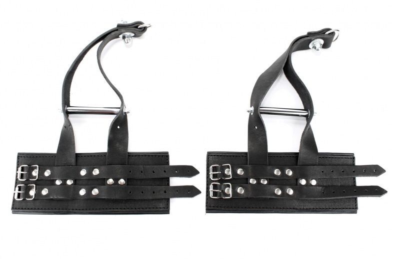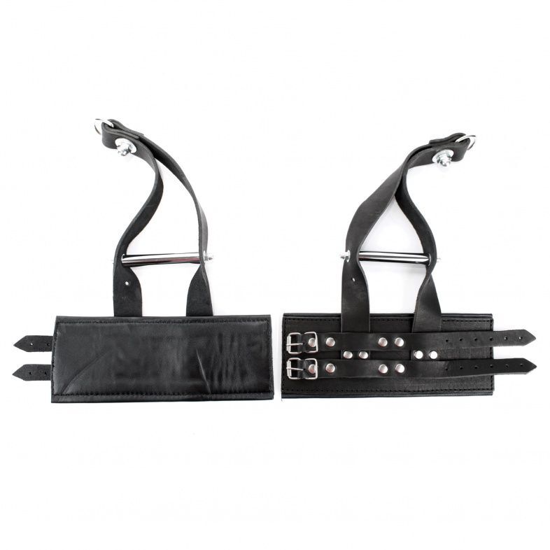 Наручники для подвешивания сделаны из надежной ременной кожи черного цвета. Руки фиксируются крепкими ремнями и металлическими пряжками, позволяющими выбрать нужный размер, подойдут на обхват от 17 до 25 см. Наручники имеют удобный металлический перехват? предназначенный для снятия напряжения с запястий. Для крепления используется сварная металлическая фурнитура. Фиксаторы выдерживают вес до 90кг. Аксессуар поможет окунуться во всю бездну эротических страстей. Ширина - 10 см. Ширина ремешков - 2 см., ремней для подвешивания - 3,5 см.