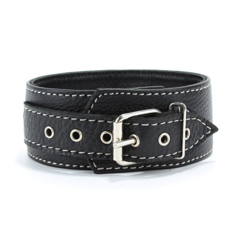 Ошейник выполнен из натуральной черной кожи с белой контрастной строчкой. Впереди расположено металлическое полукольцо, ремень сзади позволяет выбрать нужный размер, подойдет на обхват от 30 до 3 8см.Металлическая пряжка надежно фиксирует аксессуар. Мягкий подклад обеспечивает комфорт, помогая полностью погрузиться в БДСМ игру. Ширина - 5 см.