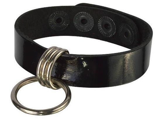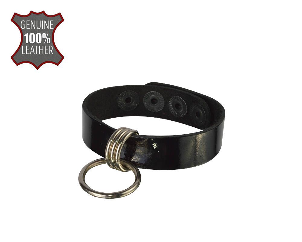 Браслет из натуральной лаковой кожи, украшен подвесным металлическим кольцом. Регулируется при помощи кнопок. Металлическое кольцо имеет никелевое покрытие. Ширина - 1,5 см.